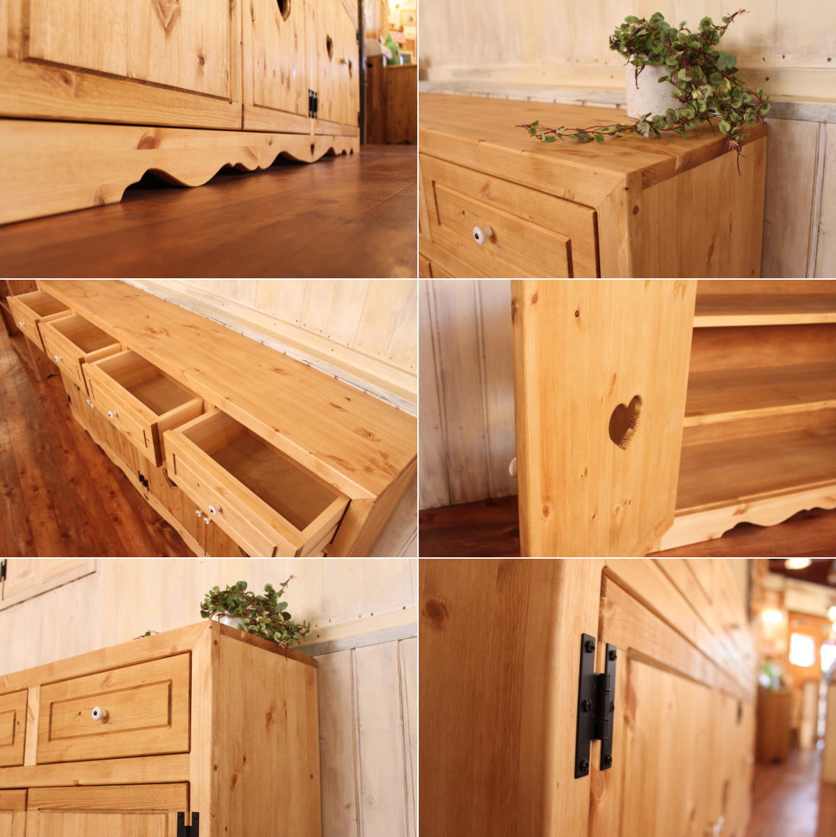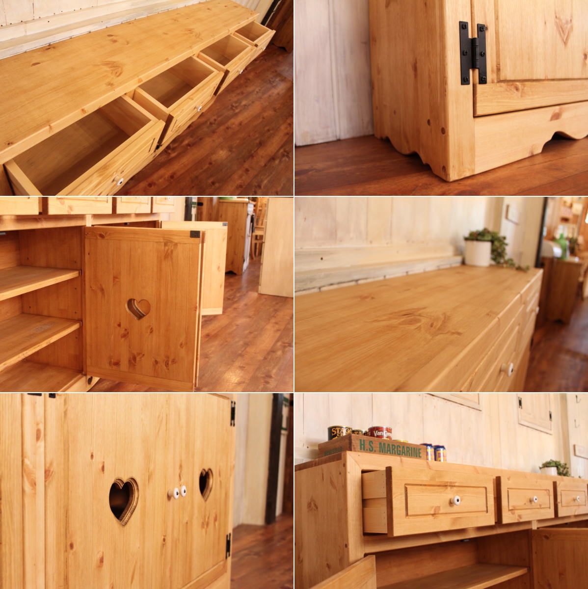 ■商品名 カウンター下収納・ハートキャビネット ■送料 送料サービス (北海道、沖縄、一部離島はお見積もり) ■サイズ 幅1800 奥行き300 高さ880mm ・扉内内寸 幅840/奥行き280/高さ560mm×2 ・各扉内可動板2枚づつ ・引き出し内寸 幅353/奥行き233/高さ132mm×4 ■材質 北欧パイン ■カラー ※画像の商品はミディアムウォルナット (注)※カラー変更をご希望の場合 カートのシステム上、カラー変更時の自動計算が出来ません。