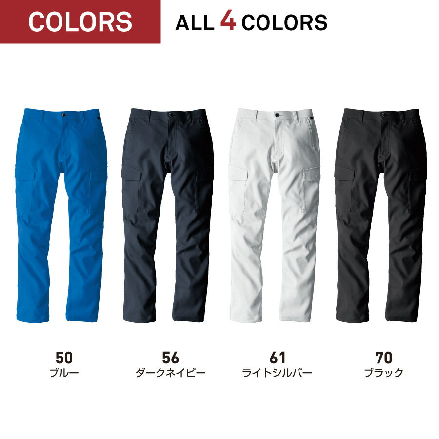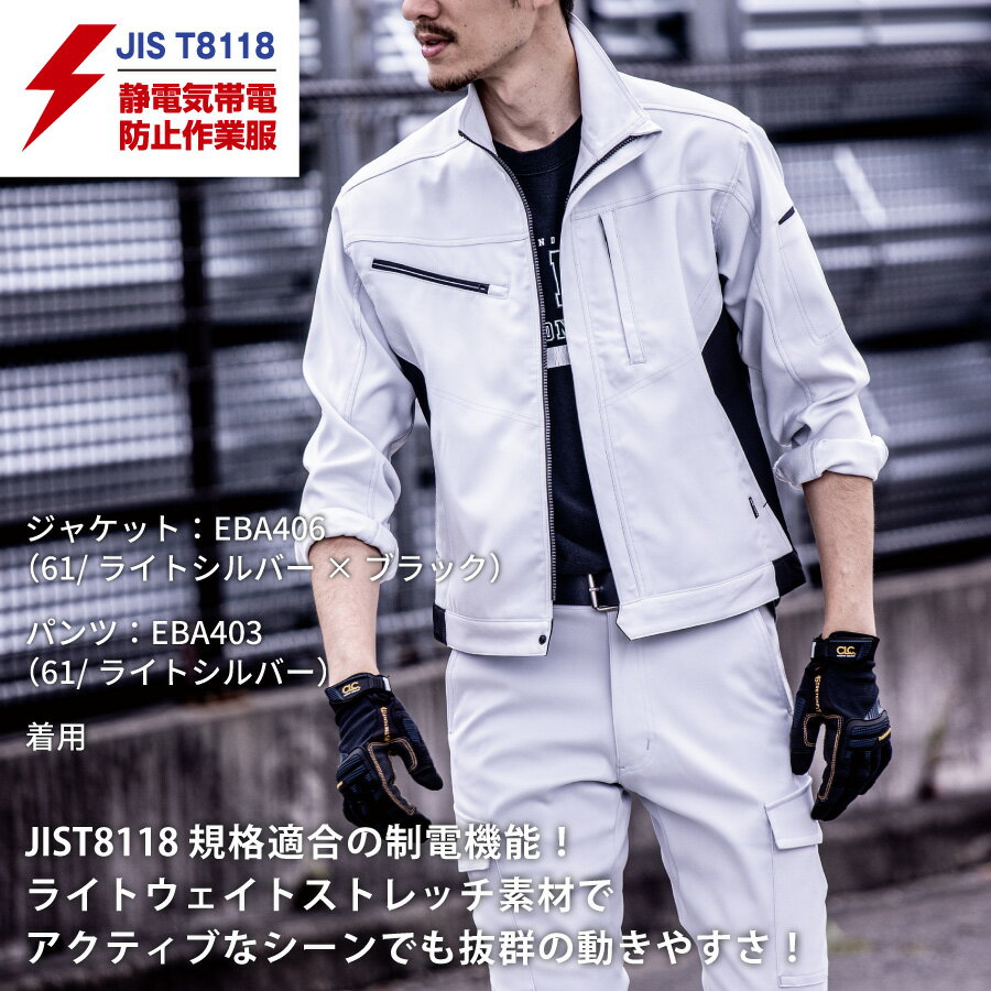 JIST8118規格適合の制電機能! ライトウェイトストレッチ素材でアクティブなシーンでも抜群の動きやすさ! 【EBA403(ノータックカーゴパンツ)】 ・オールシーズン ・4色展開 ・サイズ:70~120 【DETAIL】 ・JIST8118適合品(製品制電) ・ストレッチ素材 ・ウエストストレッチ ・コインポケット ・ブランド刻印ボタン ・隠しドットボタン(カーゴポケット) ・国産素材使用 【素材】 裏綿ストレッチツイル(東レ) 【混率】 ポリエステル94%・綿6% 【カラー】 50/ブルー 56/ダークネイビー 61/ライトシルバー 70/ブラック 【連動商品】 ・ジャケット:品番EBA406 ・ノータックパンツ:品番EBA401 注意:ご利用のモニター環境により、色合いが異なって見える場合がございます。
